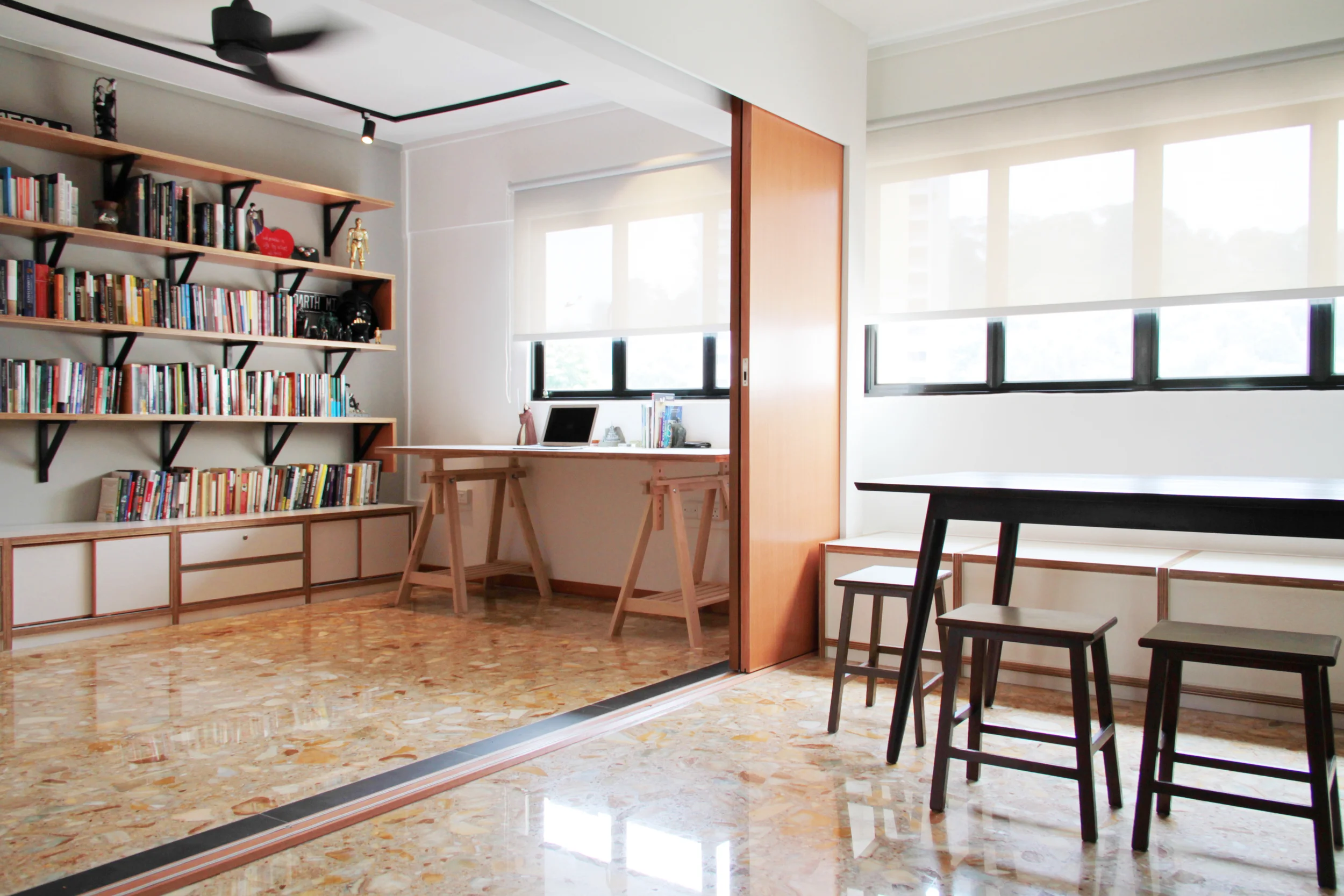 A 90s 3-room flat in Tampines with a simple palette of colours and materials, and glorified pipes and trunking.